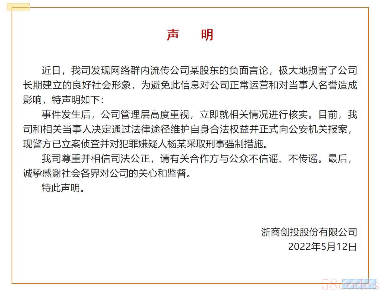 5月12日下午5点,浙商创投发布声明称,发现网络群内流传公司某股东负面言论,极大地损害了公司长期建立地良好社会形象。