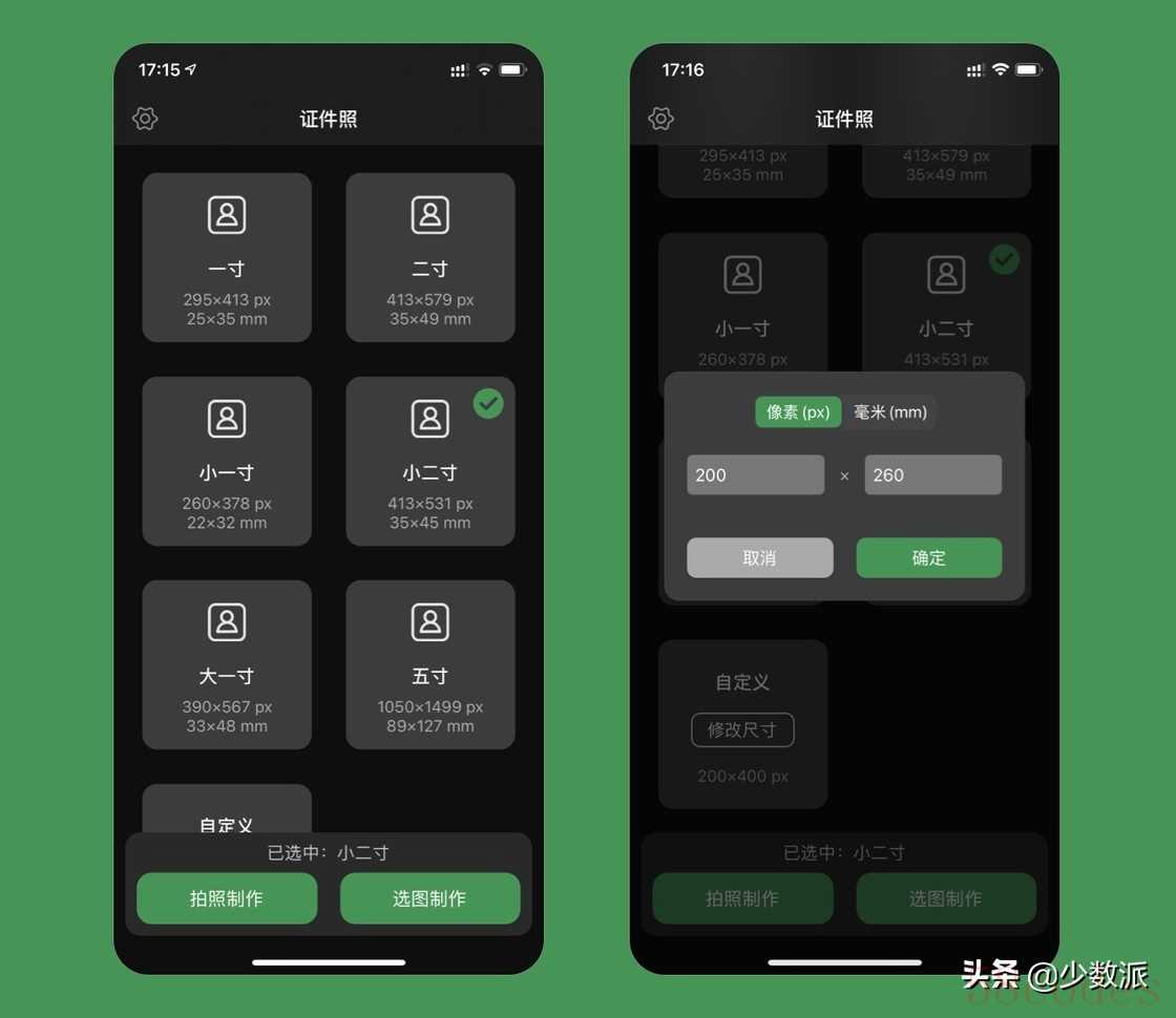 《白描证件照》支持基本的证件照尺寸,目前包括一寸、二寸、小一寸、小二寸、大一寸、五寸,如果这些基本的无法满足,还可以自定义尺寸,自定义尺寸可以按照像素或者毫米进行定义。支持从相册选图制作和拍照制作。