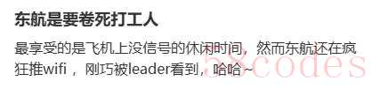 还有网友吐槽:“飞机上最享受的,就是那几个小时的失联,但东航偏要推WiFi,结果刚巧被leader看见了……”