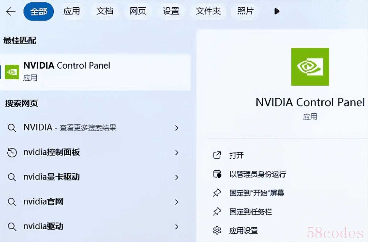 在开始菜单的搜索框中,输入 "“NVIDIA 控制面板”"。