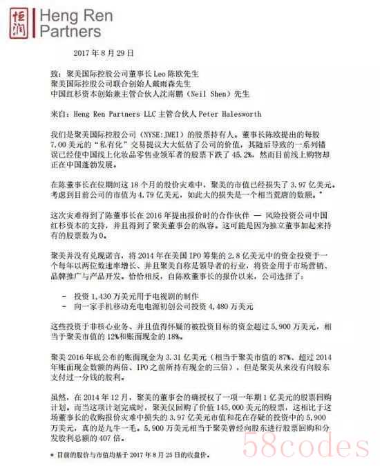 8月29日,聚美的美国股东恒润投资(HengRenPartners)发布公开信,指责陈欧在过去22个月不与股东交流,并质疑聚美和陈欧对共享充电宝以及电视剧的投资。9月13日,聚美优品报收3.26美元,上市三年来,股价已较发行价跌去85%。