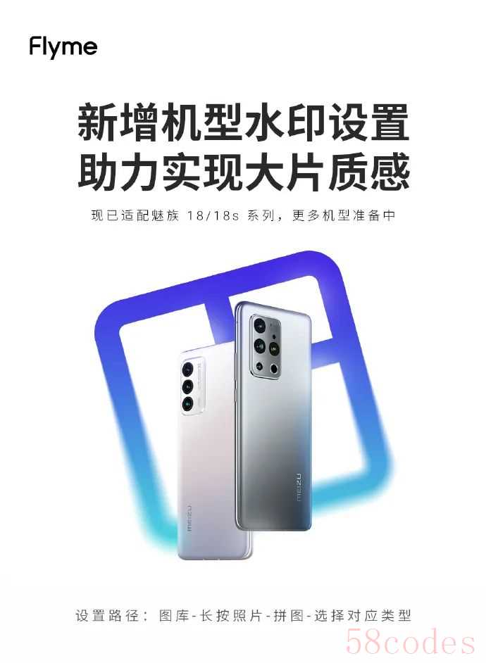 @Flyme 官方发博称,魅族 18/18s 推送了版本更新,新增了机型水印设置。
