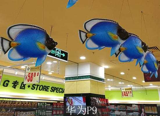 华为P9拍摄出的照片可以明显看出整体亮度的提高,不仅是屋顶部分,一旁的绿色标牌颜色也更亮,同时海洋鱼身上的色彩对比度也明显的提高了不少。