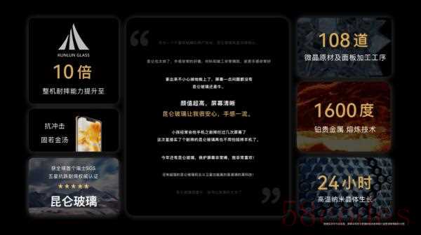 一块昆仑玻璃,拥有数量高达亿亿个高强度的纳米晶体,使得玻璃的坚韧性获得大幅提升,再搭配复合离子强化注入技术,在玻璃表面形成微米级坚硬保护层,使得昆仑玻璃的抗跌落能力提升数十倍。