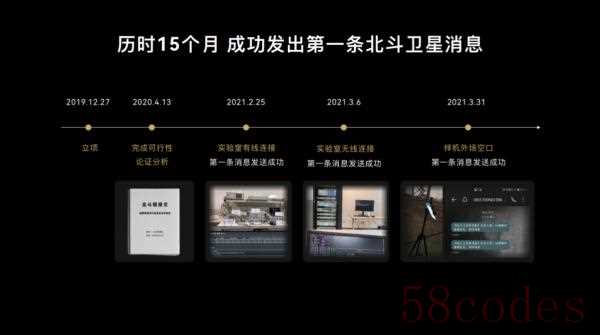 据华为官方介绍,北斗卫星消息功能于2019年底正式立项,从2020年4月13日完成可行性论证分析到2021年3月31日完成样机外场空口消息发送实验,历时15个月,成功发出第一条北斗卫星消息:星辰大海,纵横相依。遥遥星光,向你而来。