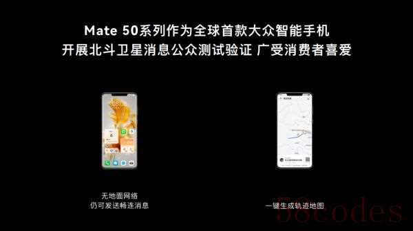 华为Mate50,作为全球首款支持北斗卫星通讯的大众消费级产品,支持北斗三号系统的短报文功能,实现了卫星通信能力与智能手机结合。在无地面网络信号覆盖的环境下,华为Mate50系列能够通过App,将文字和位置信息向外发出,与外界保持联系,并支持多条位置生成轨迹地图。