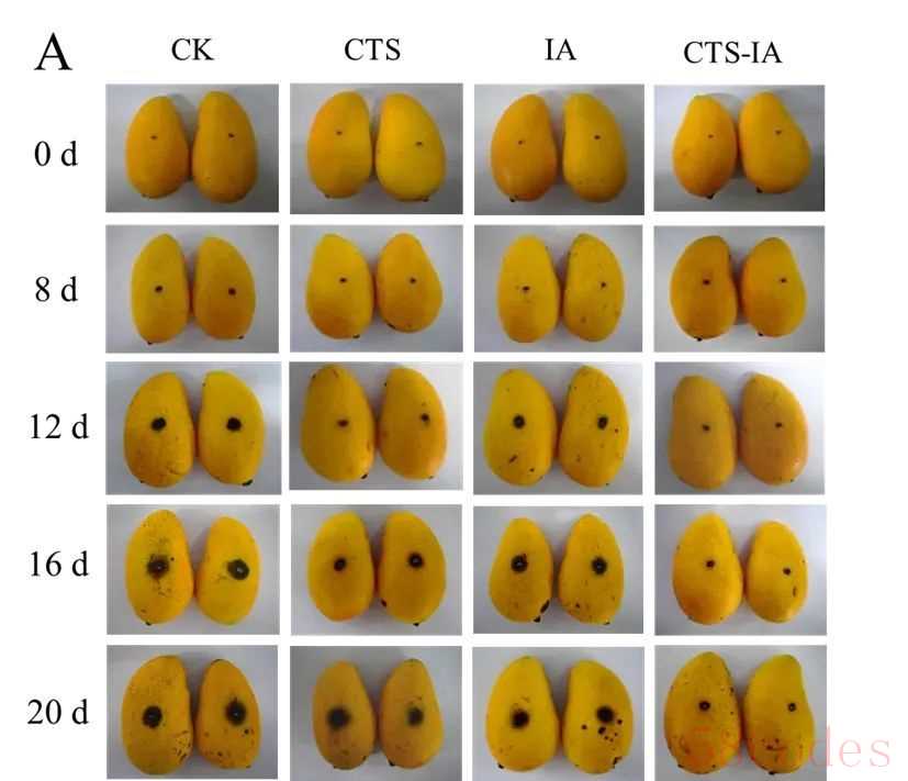 IA/壳聚糖复合膜对台农芒果冷库贮藏的保鲜效果 CK、CTS、IA、CTS-IA分别为清水对照组,壳聚糖溶液处理组、IA 溶液处理组,IA/壳聚糖复合膜处理组。图片来源:参考文献