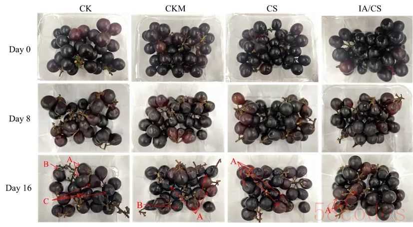 IA/壳聚糖纳米微胶囊对巨峰葡萄常温贮藏的保鲜效果 CK、CKM、CS、IA/CS 分别为清水对照组,空载壳聚糖纳米微胶囊处理组,高浓度壳聚糖溶液处理组、IA/壳聚糖纳米微胶囊处理组。A、B、C 箭头分别指示储存后葡萄果粒表面凹陷,果粒表面霉斑及腐败,果粒脱落。图片来源:参考文献
