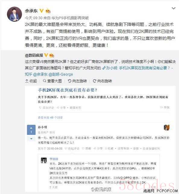 华为公司高级副总裁余承东先生在个人微博上对2K分辨率的问题表明了自己的看法:“2K屏的最大难题是会带来发热大、功耗高、续航急剧下降等问题,之前行业技术并不成熟,有些厂商提前使用,影响到用户体验。现在我们在2K屏的技术已经完善,同时,2K屏和正流行的VR也更契合,我们追求的是,不只让喜欢尝新的用户看得更清、更爽,还能看得更舒服、更健康!”