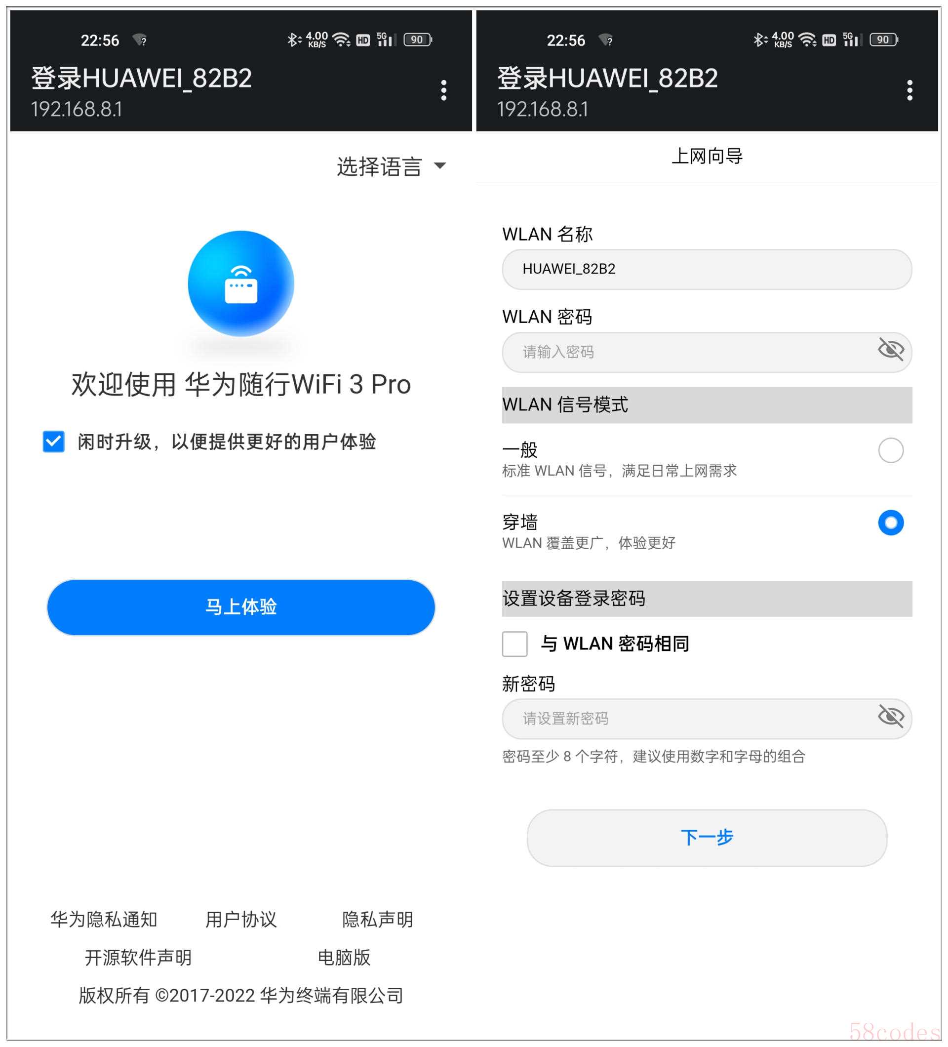 华为随行WiFi 3 Pro的联网设置非常简单,也有二种不同的方法。我们首先是说一下最常用到一种方法,使用手机或者电脑连接上华为随行WiFi 3 Pro的WIFI信号,就会自动跳转到联网设置的操作界面,然后根据提示填写WLAN密码、选择WLAN信号模式、设置登录密码就可以了。如果连接WiFi后没有自动跳转到联网设置的操作界面,我们可以在浏览器输入:192.168.8.1 ,然后敲击回车键,就会转到设置界面。