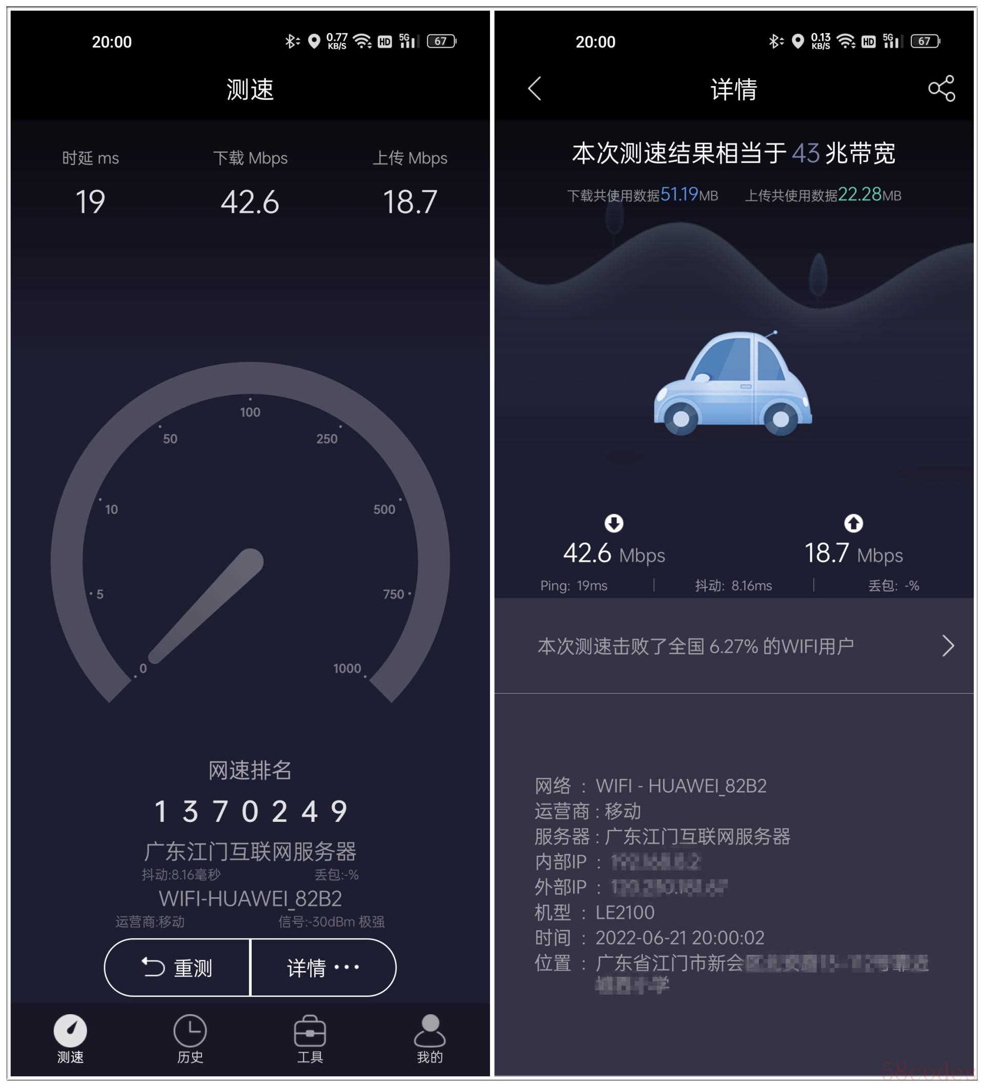另外,除了天际通流量卡,我还插入了自己使用的中国移动4G手机卡,用另外一款测试软件进行测试,相比天际通,中国移动4G卡的WiFi网络要更好一些,下载速度提升到了42.6Mbps,上传速度也提升到了18.7Mbps,相当于43M宽带的网速。
