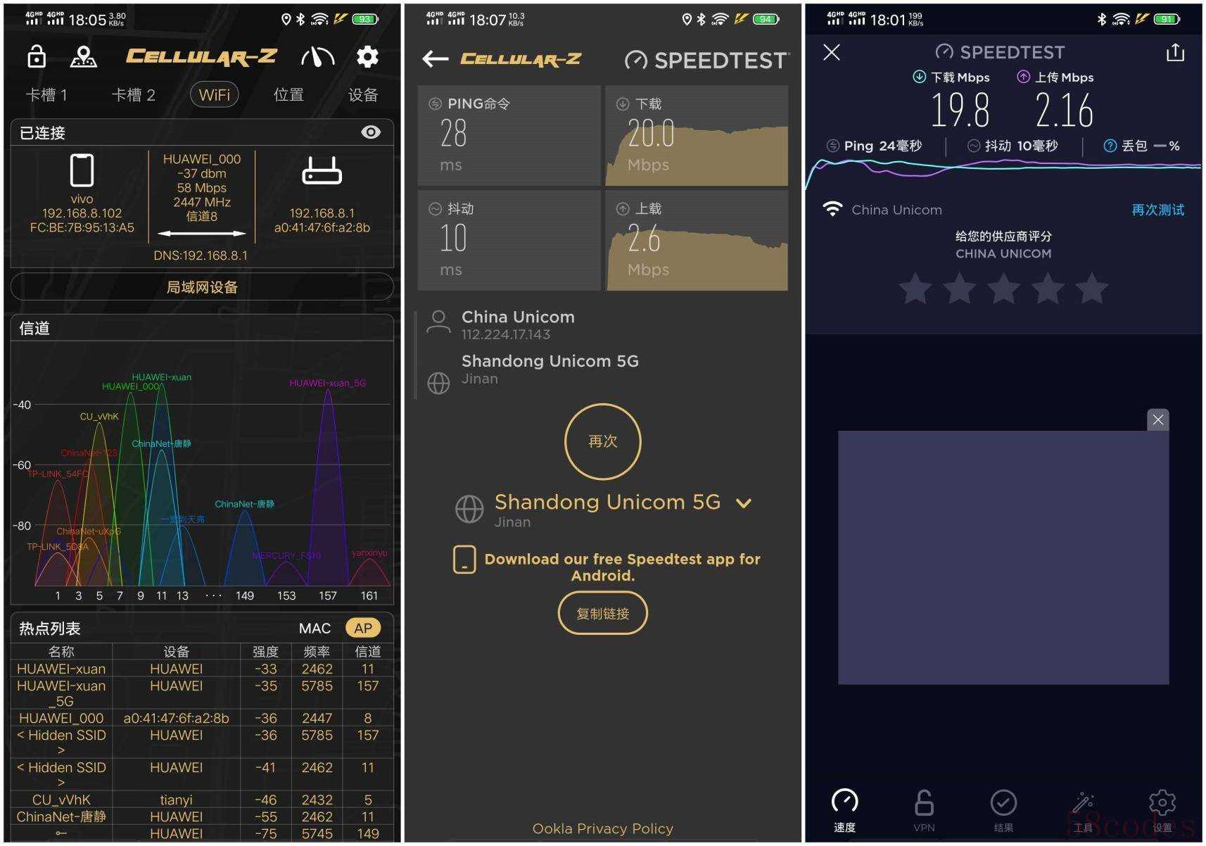 再来看看这款华为随行WiFi 3的测试速度如何,2个软件,使用的是4G联通卡,下载有20Mbps,上传有2Mbps左右,不过使用起来并不觉得卡顿,如果换成移动的不知道会怎么样。