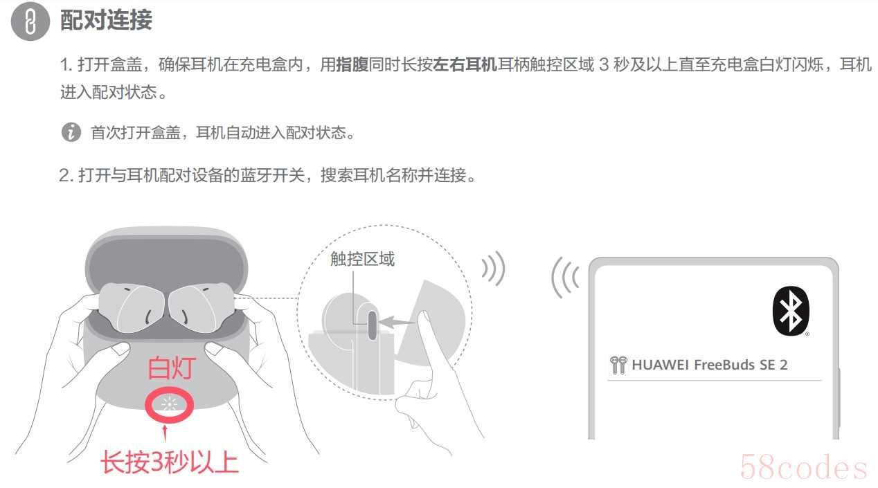 对于首次配对的用户,只需打开耳机充电盒盖,耳机便会自动进入配对状态,等待与您的设备相连。若已非首次配对,则需确保耳机置于充电盒内,随后用指腹同时长按左右耳机耳柄的触控区域3秒及以上,直至充电盒白灯闪烁,耳机即进入配对模式。此时,打开您设备的蓝牙开关,搜索并选择“华为FreeBuds SE 2”进行连接即可。