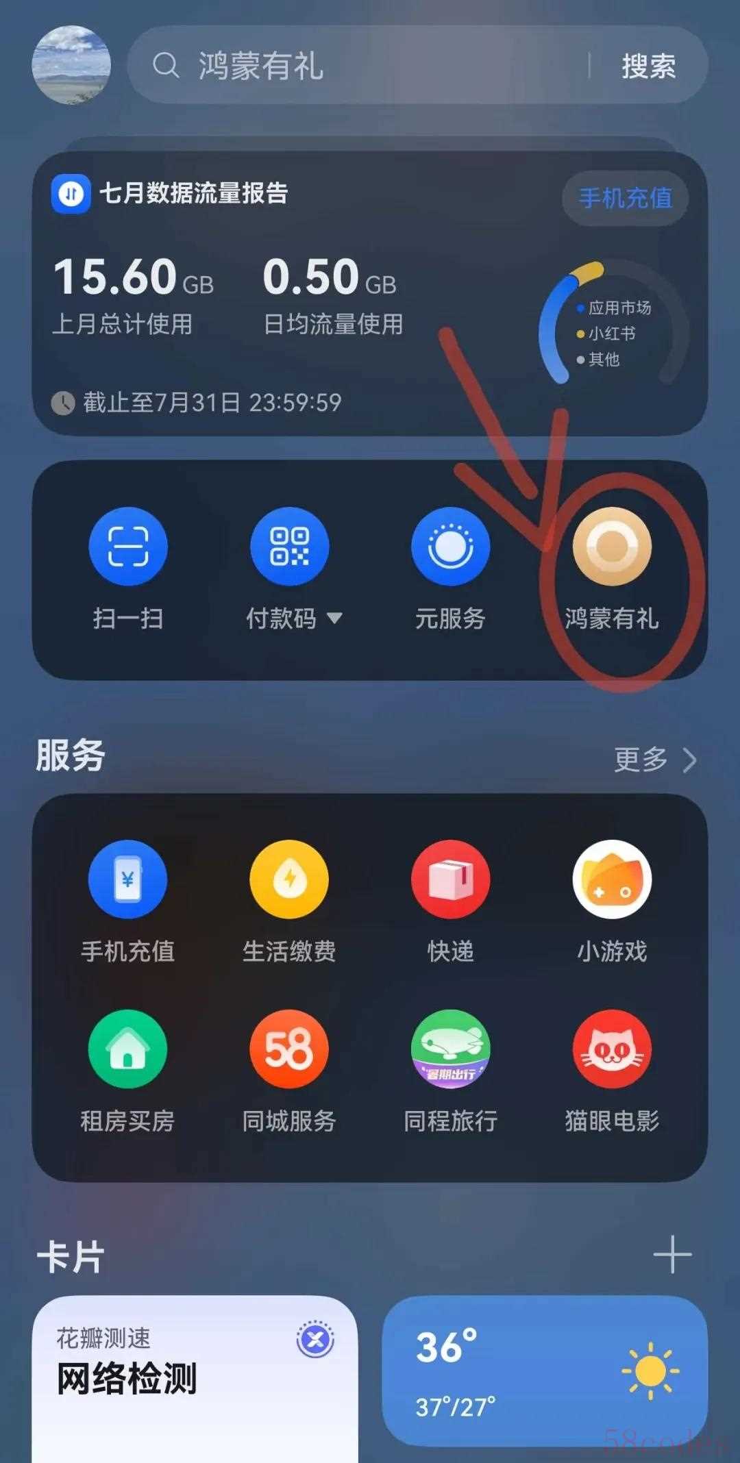 手机桌面向右滑动进入负一屏 ,点击 “鸿蒙有礼”入口。