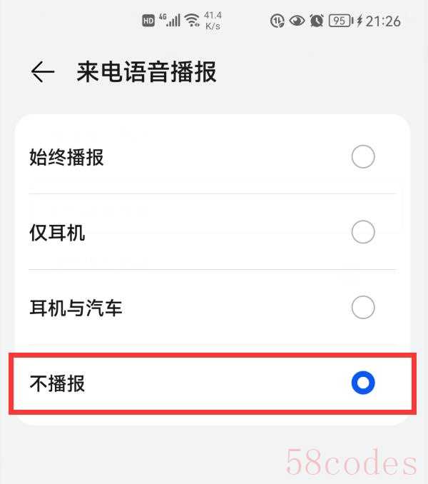 选择“不播报”(如上图),这样就关闭了“来电语音播报”功能,然后,手机接到电话时,就只会播放“视频铃声”了。
