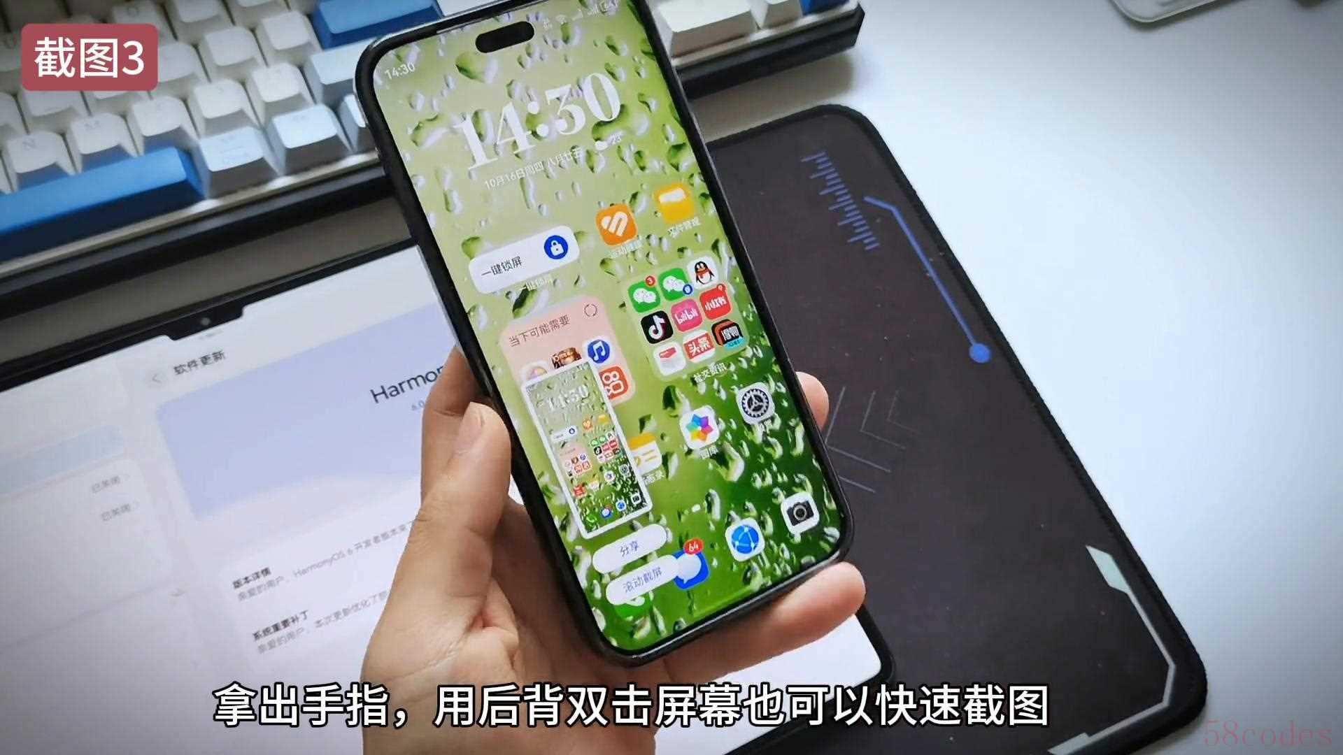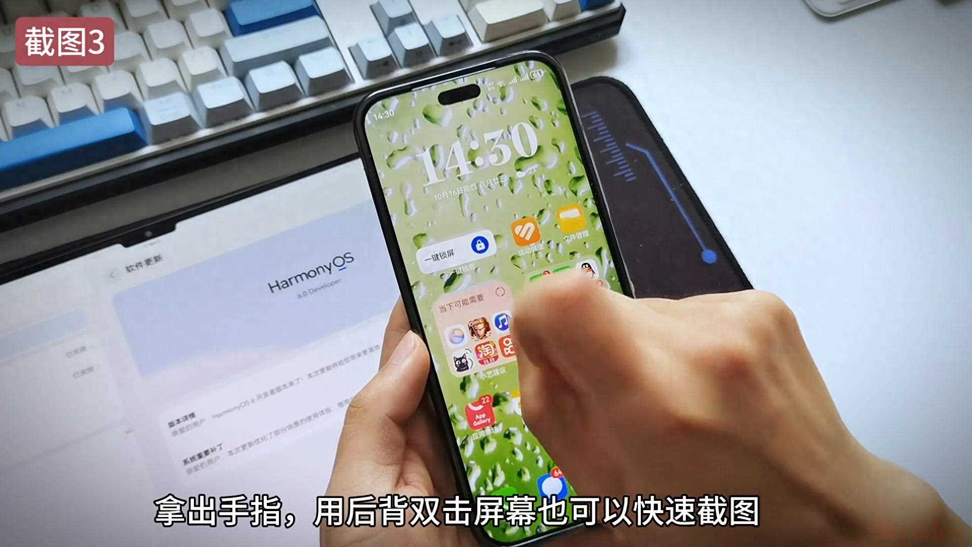 ·第3类截图方式:拿出手指用后背双击屏幕也可以快速截图,画个圈圈可以实现局部截图,图形大小可随意调节,画个s可以实现滚动截图。