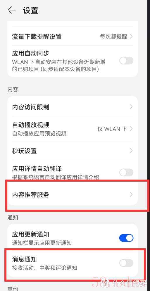 6. 应用市场——我的——设置——内容推荐服务关闭。消息通知(接收活动,中奖,评论通知)关闭。