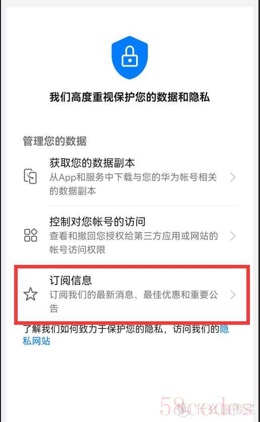 2. 设置。设置——华为账号——隐私中心——订阅信息。关掉之后相关的优惠广告推送就不会有了。
