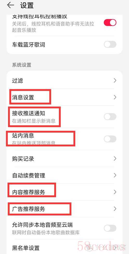 8. 华为音乐——我的——设置——消息设置,接受消息通知,站内消息,内容推荐服务,广告推荐服务等全部关闭。