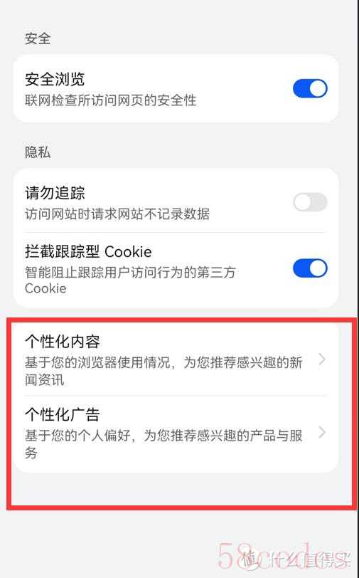 安全与隐私——个性化内容和个性化广告全部关闭。