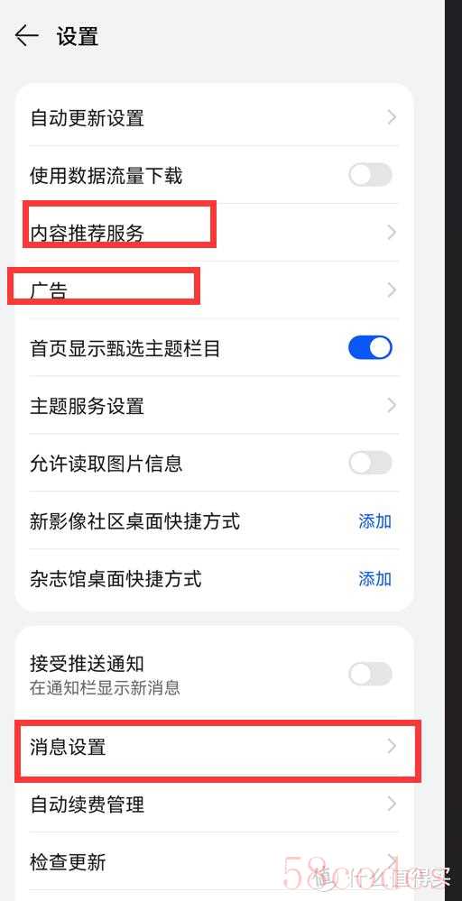 13. 主题——我的——内容推荐服务关闭,广告全部关闭,接受推送通知关闭,消息设置里面全部关闭。