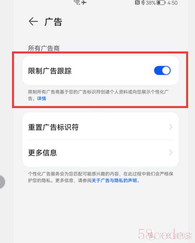 4. 设置——HMS CORE——广告——限制广告跟踪按钮打开。