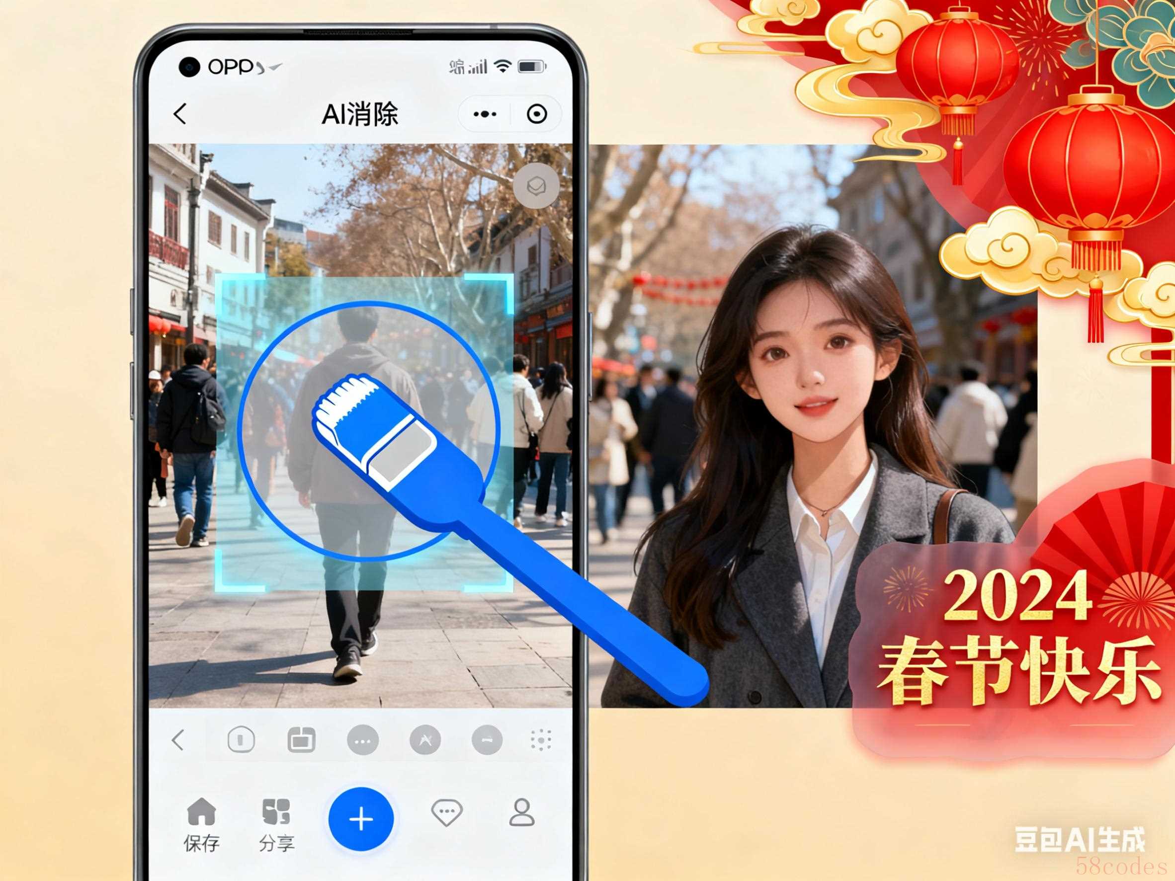 OPPO的编辑功能主打“智能+潮流”,AI消除堪称一绝,水印还会搞节日限定。