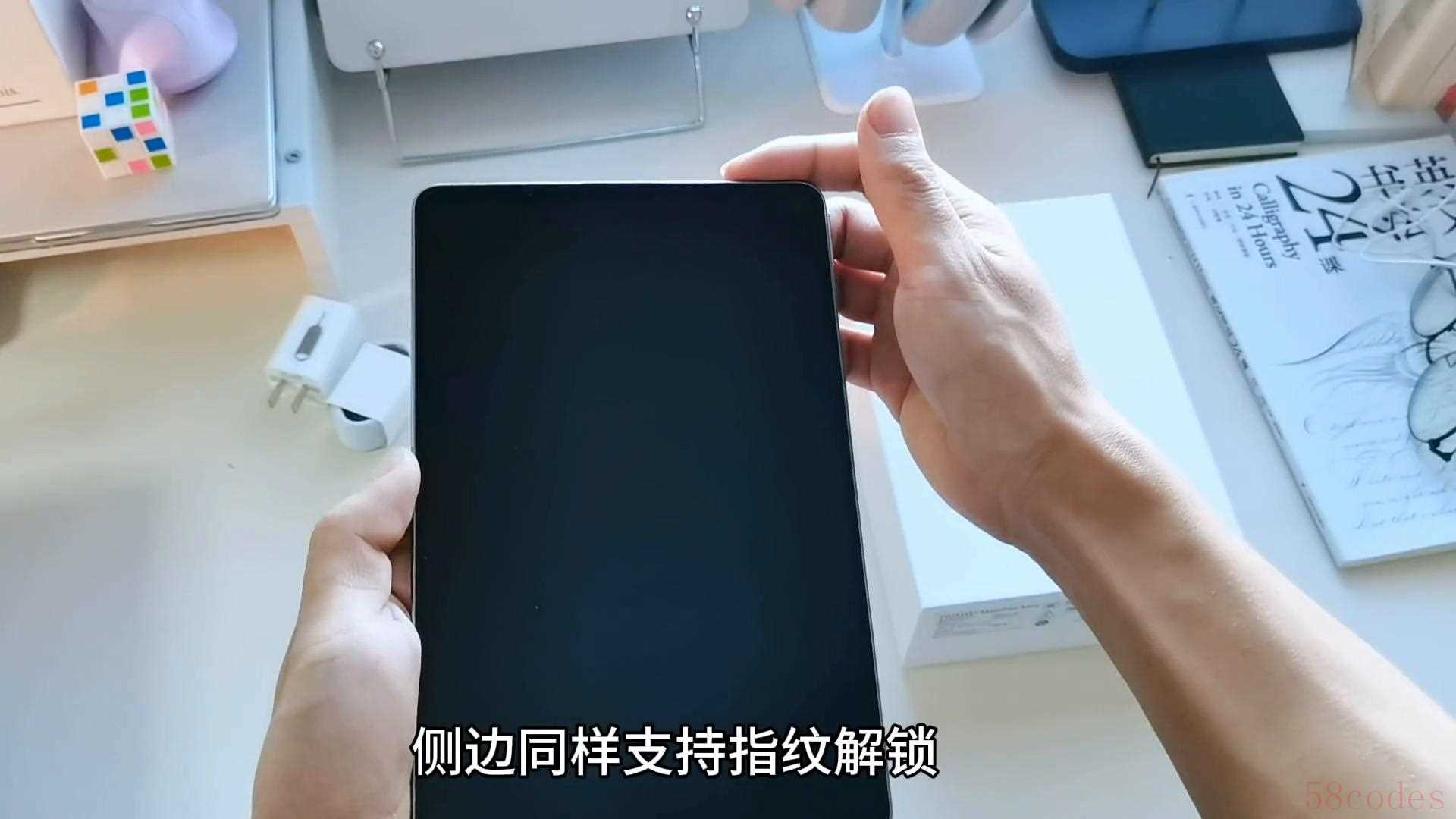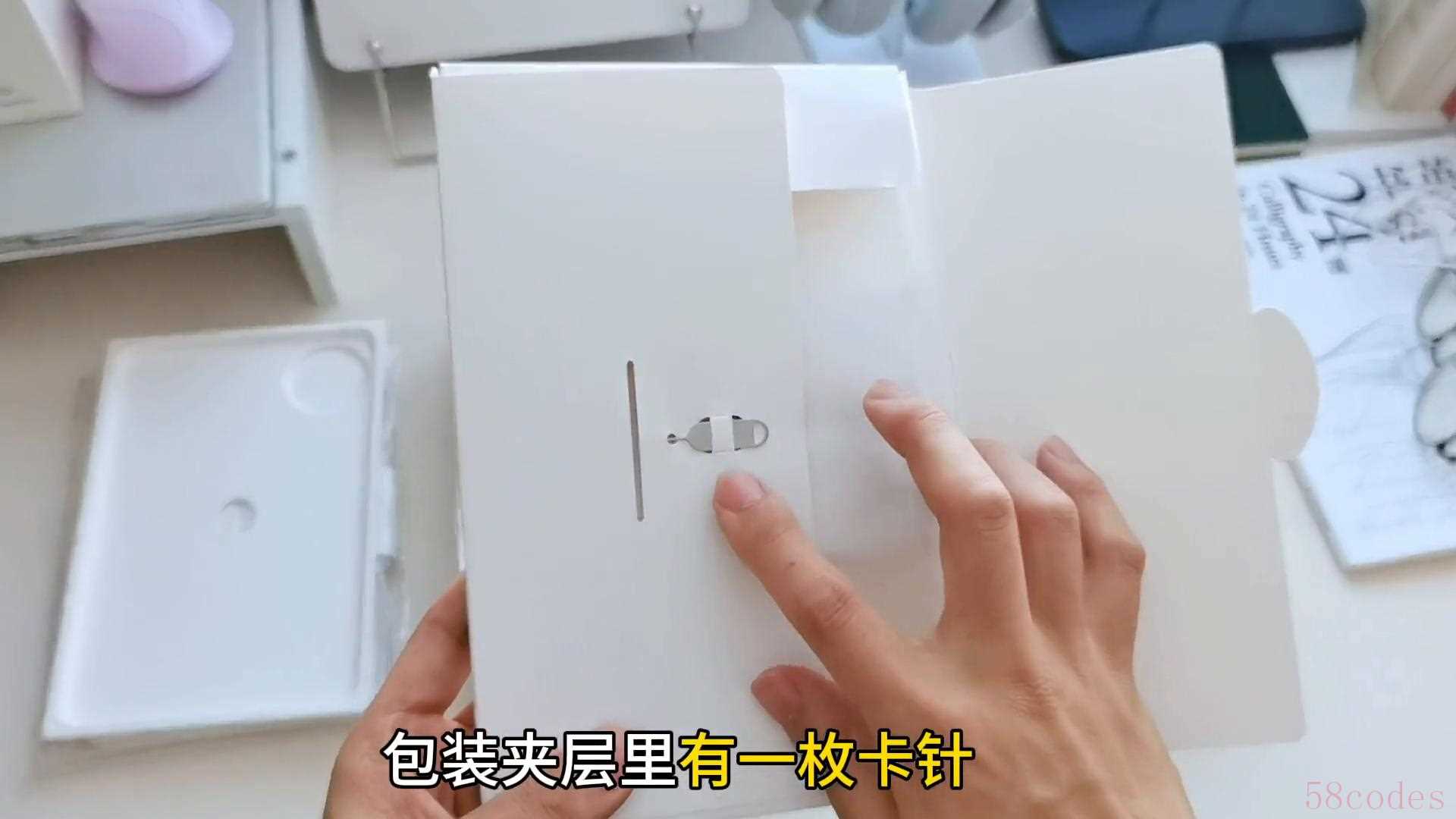 先来看看包装里有哪些配件。平板8.8英寸,单手也能轻松握持住,甚至比我手中的A5笔记本还小。包装夹层里有一枚卡针,为侧边卡槽准备的,方便可以插卡使用。配件还有个原装透明保护壳,套上平板后比较反光,要是磨砂材质会好一些。配件清单还有:快速指南、65瓦快充头、双C口数据线。