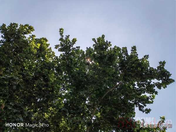 荣耀Magic3 Pro样张 以上是一组荣耀Magic3 Pro在强烈日光下拍摄的样张,不难看出,在第一张样张中,周围建筑与天空的色彩反差还是很大的,尤其是在强光照射下,一般的产品很难把控色彩,而Magic3 Pro这方面做得还不错。在第二张拍摄逆光绿叶样张时,虽然是冲着太阳拍摄,不过大树上的叶子还是看的一清二楚,并没有出现发黑的情况,阳光透过绿叶,反而带来了不一样的观感。