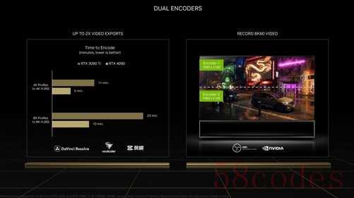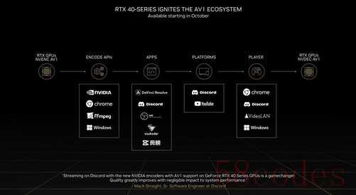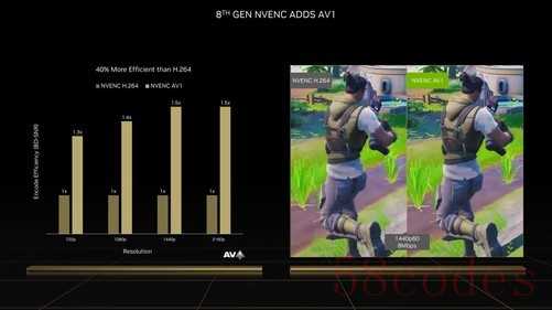 另外由于DLSS 3的帧生成是在GPU中处理和运行的,所以即使遇到CPU瓶颈的游戏,AI同样能够提升帧率。这也是为什么在此次发布会中说到,DLSS 3能够突破CPU的限制来提升帧数。双AV1编码器本次升级的第八代NVENC编码器可以说是直播、视频、后期工作者的极大福音。它首次加入了对AV1编码的支持,最显而易见的效果就是直播。