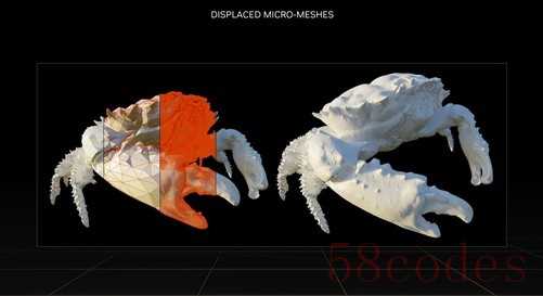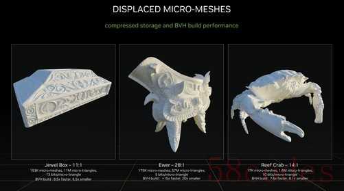 不过Opacity Micro-Map Engines可以将光线追踪特性烘焙到不透明蒙版中,所以那些不规则形状和半透明的对象,也就能够更快更精准的渲染出来,从而极大减轻着色器的工作负担。Displaced Micro-Mesh Engines(DMM)Displaced Micro-Mesh Engines可理解为微网格置换引擎,它构建光线追踪的BVH(Bounding volume hierarchy)的速度提高了10倍!所使用的的显存减少了20倍!