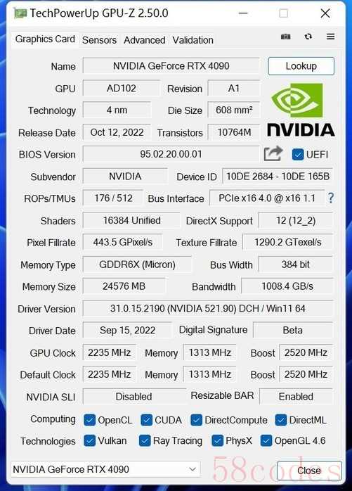 首先看一下GPU-Z的参数,NVIDIA GeForce RTX 4090采用AD102核心,采用TSMC 4nm定制工艺(TSMC 4 nm NVIDIA Custom Process),芯片面积608平方毫米,这里相对于RTX 30系的GA102的628平方毫米更小。拥有16384个CUDA,相比RTX 3090 Ti的10752多52%,Boost频率达到了2520MHz,而RTX 3090 Ti为1860MHz,提升非常大。采用24GB GDDR6X Micron显存,位宽为384bit,显存带宽达到了1008.4 GB/s,光栅单元和纹理单元为176和512。05 理论性能测试