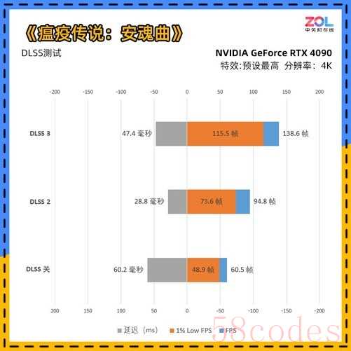 《瘟疫传说:安魂曲》是即将发布的一款游戏,在DLSS 3和DLSS关之间的帧数提升,同样达到了130%。可以看到虽然DLSS 3的延迟有所增加,但仍然比DLSS关闭后要低。