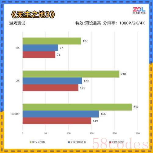 在《无主之地3》中,GeForce RTX 4090相比GeForce RTX 3090 Ti的提升分别为:1080p提升43%;2K提升63%;4K提升65%,综合提升57%。
