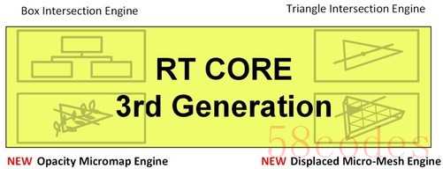 而在第三代光追核心中,还增加了两个新的引擎:Opacity Micro-Map Engines(OMM)和Displaced Micro-Mesh Engines(DMM),这两个新的硬件单元可以极大地提升光追性能(具体原理后文详细介绍)。