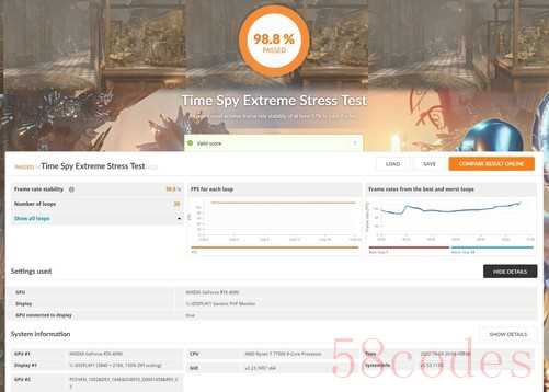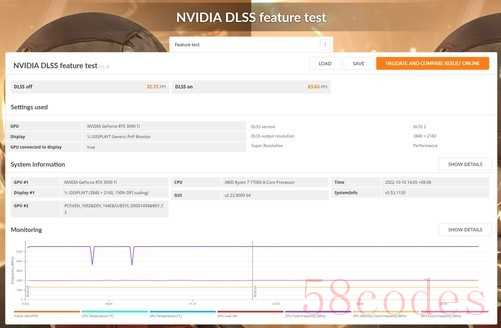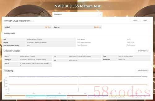 在本次测试中,我们使用3DMARK的测试版进行了DLSS 3的相关测试。其中DLSS关闭为52.19帧,DLSS 3开启后为154.98帧。