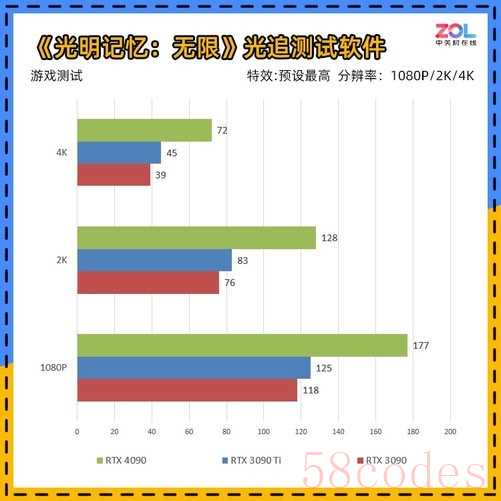 《光明记忆:无限》的光追测试软件是独立于游戏的测试工具,比游戏中用到的光线追踪技术更多,测试条件为“RTX最高/DLSS质量”。所以测试帧数相对较低,但实际游戏配置相当亲民。性能方面,GeForce RTX 4090相比GeForce RTX 3090 Ti的提升分别为:1080p提升42%;2K提升54%;4K提升60%,综合提升52%。