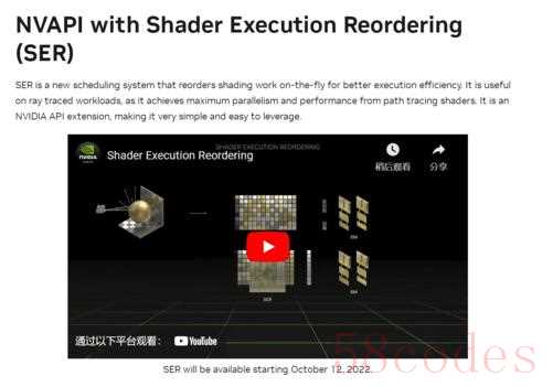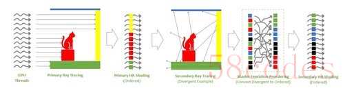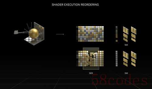 至此,每2个SM单元组成一个TPC单元,每6组TPC单元组成一个完整的GPC顶层单元(在部分核心中,会出现5组TPC组成一个GPC单元的情况)。而每个GPC单元又搭载一个独立的光栅引擎、两组ROP分区(每组包含8个ROP单元)。过多关于数数的部分就不再介绍了,毕竟此次架构图的大面上与NVIDIA Ampere架构基本相同,下面我们分别来看看,除了性能Ada架构还有哪些升级。Shader Execution Reordering (SER)着色器执行重排序SER主要的作用是提升着色器性能,它可以将效率低下的工作负载,动态重组为更高效的工作负载。主要针对光线追踪的性能提升非常大。简单地说,GPU在执行类似工作的时候效率最高。但随着光追效果越来越强大,每个场景可能有数百万条光线照射在不同材质上,而我们知道不同材质的反射率,以及反射效果也是不同的。所以这样就为着色器创建了大量的、发散的,效率低下的工作负载。