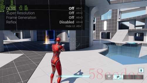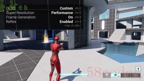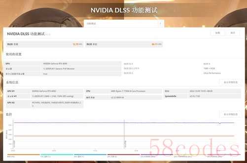 在UE5提供的测试游戏中,方便的给出了DLSS的快捷测试,这里分为DLSS关(超分辨率关+帧生成关+Reflex关);DLSS 2(超分辨率性能+帧生成关+Reflex开);DLSS 3(超分辨率性能+帧生成开+Reflex开)三档测试。其中,DLSS关的即时帧数为66帧,DLSS 2为112帧,DLSS 3为154帧。不过UE5这个测试的DLSS 3延迟为57.1ms,而DLSS 2为20.5ms,相对较高。08 专业软件测试