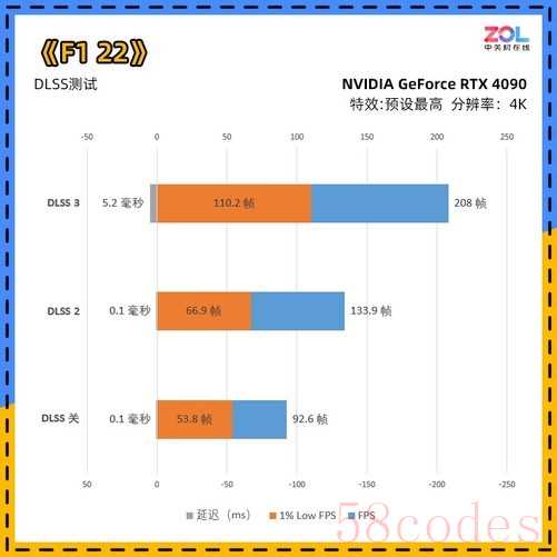 目前《F1 22》的数据测试同样有问题,在DLSS关和DLSS 2中均没有延迟数据。这一组主要看帧数的提升。其中DLSS 3相比DLSS关的帧数提升了124%,相比DLSS 2的提升也达到了55%。