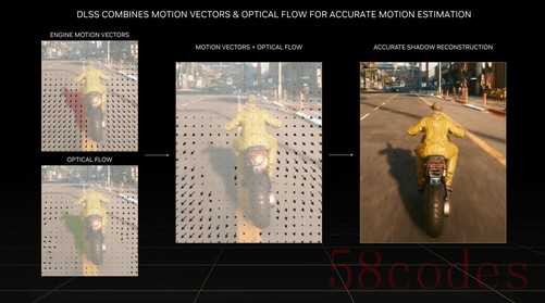 这也不负NVIDIA给它起了个“神经网络渲染新时代”的名号。纵观目前市面上的XeSS、FSR技术,DLSS绝对称得上“巨人的肩膀”。当然,连年的创新,苦的是手持上一代显卡的玩家,想体验DLSS 3的帧生成,目前唯一的办法就是购入一张RTX 40系显卡。New Optical Flow AcceleratorNew Optical Flow Accelerator光流加速器是在第四代Tensor Cores中最新引入的,这也是为何DLSS 3中的帧生成为RTX 40系显卡独享。光流加速器在原本DLSS 2的基础上,还可以计算两个连续帧内的光流场,能够捕捉游戏画面从第1帧到第2帧的方向和速度,从中捕捉粒子、反射和光照等像素信息。并分别计算运动矢量和光流来获得精准的阴影重建效果。
