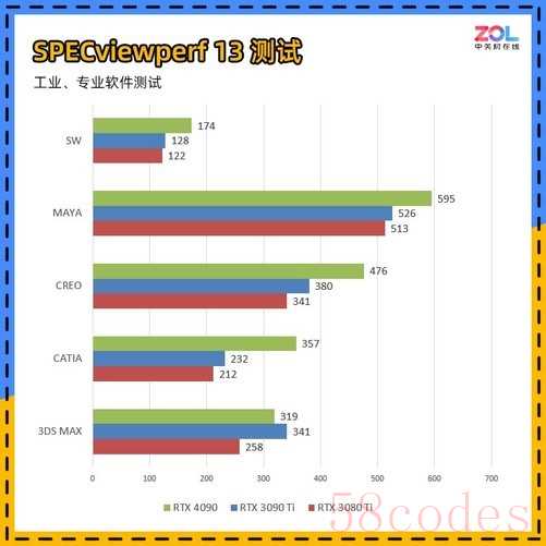 作为“90”级别的显卡,拥有24GB的超大显存,内容创作者领域的应用是必不可少的。我们使用SPECviewperf 13这款工业、专业软件跑分测试。对比显卡为GeForce RTX 4090显卡、上一代旗舰GeForce RTX 3090 Ti显卡以及上一代游戏旗舰GeForce RTX 3080 Ti显卡。