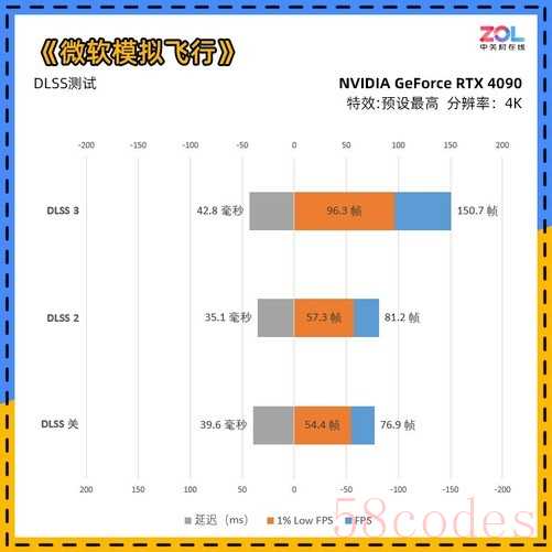 看懂了1% Low FPS,我们再来看这张图表,在坐标轴左侧的为延迟(越低越好),坐标轴右侧的均为帧数(越高越好),并且由于牵扯到正负坐标,所以两侧的值有可能会不同。由于目前测试DLSS 3的游戏均为测试版,所以难免出现BUG。在《微软模拟飞行》中,在开启和关闭DLSS 2的时候,分数几乎无变化。这款游戏是极度吃CPU资源的游戏,如果瓶颈卡在处理器上,那么传统的DLSS 2的确无法提供更多的帧数加成。而在DLSS 3中,我们能够明显看到帧数的大幅提升,要知道我们所有DLSS 3的测试均在4K分辨率下进行。看来利用帧生成来突破CPU瓶颈限制,实际表现确实如宣传的那样神奇。不过帧生成并不是毫无弊端,这也是为什么此次测试加入了延迟。并且在开启DLSS 3后,NVIDIA Reflex是捆绑开启的。但相对于DLSS 2增加的这点延迟,在实际体验中的感受并不强。