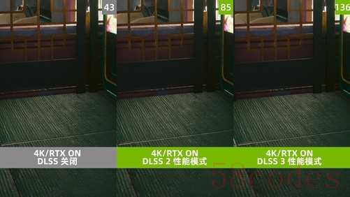 另外我们也测试了GeForce RTX 3090 Ti在该程序下成绩,其中DLSS关闭为32.73帧,由于不支持DLSS 3,所以在DLSS 2下的成绩为83.63帧。以两代不同架构的产品来说,对比有些不公平,我们对比自身的不同提升。GeForce RTX 4090在开启DLSS 3后,相比关闭提升了197%;而GeForce RTX 3090 Ti在开启DLSS 2后,相比关闭提升了155%。当然DLSS 3最夸张的还不止数字上这么简单,我们再来看看这张图。