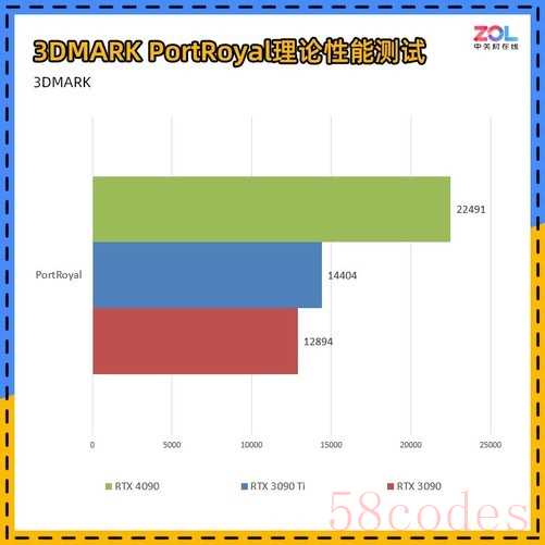 PortRoyal是3DMARK中专门针对光追性能的测试项,GeForce RTX 4090相较GeForce RTX 3090 Ti的提升约为56%。综合来看,GeForce RTX 4090的理论性能相较GeForce RTX 3090 Ti的提升约为61%。根据CUDA数量来看,这个成绩还是比较合理的。不过,其实在功耗测试中,我们发现这张卡被限制了比较大的功耗,这一点我们后边会进行详细说明。