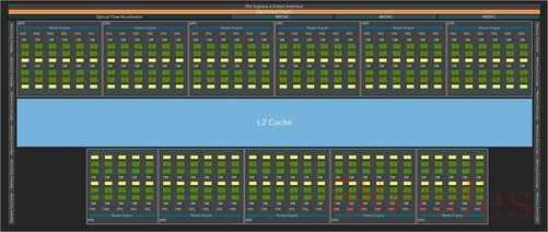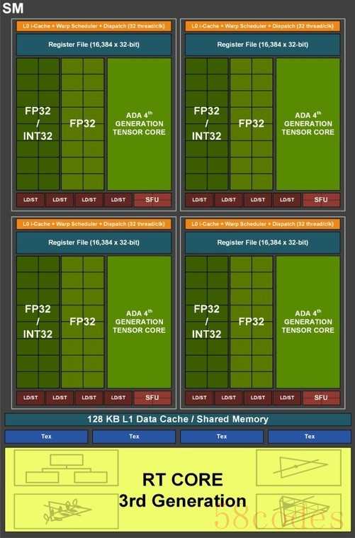 其实根据完整的架构图就能看出,此次Ada架构整体结构性的改动并不大,这一点从SM单元便能清晰印证,同样的FP32 CUDA核心,同样的FP32/INT32混合CUDA核心,同样的L1级缓存等等。当然,每个SM单元内部的Tensor Core升级为第四代。
