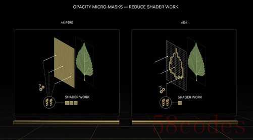 在GeForce RTX 4090这张显卡上,达到了191 RT-TFLOPs的处理能力,而RTX 30系显卡最快处理能力为78 RT-TFLOPs,足足为2.4倍。并且根据NVIDIA的官方说法,第三代RT Core的峰值RT-TFLOPs相比于前代提高了2.8倍。而这只能说明,这张4090并非Ada Lovelace架构的最终形态。Opacity Micro-Map Engines在第三代RT Cores中引入了两个重要的硬件单元,首先是Opacity Micro-Map Engines,可以理解为微映射透明度引擎,它主要的作用是优化光线追踪渲染,可大幅减轻着色器的工作负担。比如树叶之类的复杂物体,不同的光线都会影响它的表现状态,以及树叶之间的光线反弹,所以对于光线追踪的计算量是巨大的。