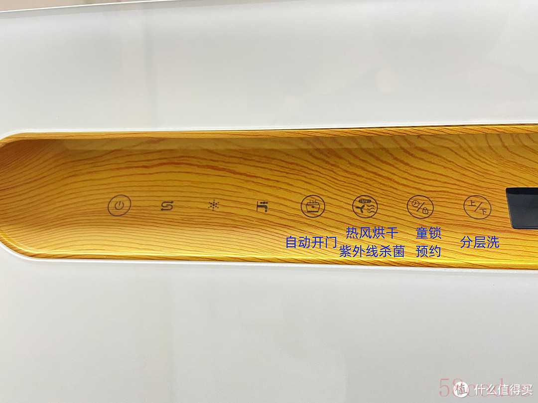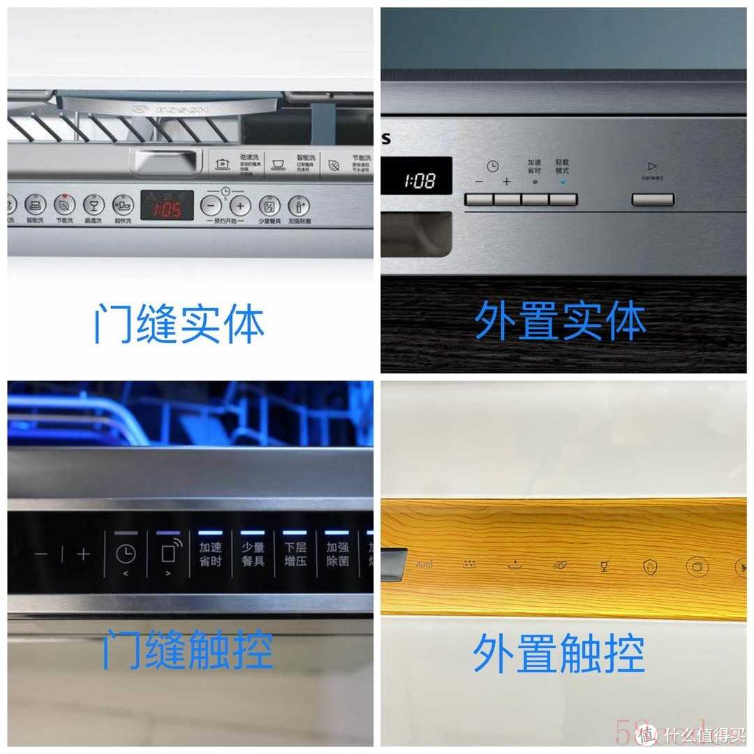 洗碗机操控面板位置分为外置和门缝两种,按键也分为触控和实体两种,位置方面,个人推荐外置面板,因为外置可以在洗碗机运行中操作按键,而门缝则需要拉开暂停洗碗机,操作起来会有些不便;按键方面,个人推荐触控按键,因为它与面板是一个整体,不仅方便打理,也能避免进水导致失灵的问题。