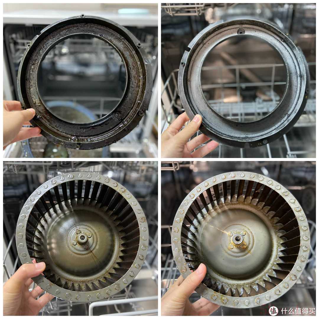 为了验证要重污清洗的能力,我把旧房近一年没清洗的油烟机接油盘和风轮放到洗碗机里进行清洗,清洗后的效果真的超出我的想象,接油盘的上的油渍彻底清洁没了,风轮上虽然还残存了一些油渍,但比我平时手洗的效果强多了。