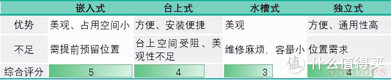其中,嵌入式、水槽式如果没有预留合适尺寸,改造条件较高,但独立式、台上式安装相对方便,只要厨房有多余的地面或者台面空间即可安装。